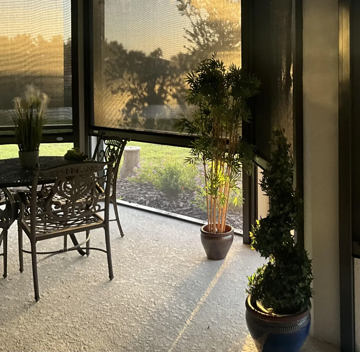 Our premium solar mesh maintains 55%+ visibility and retracts completely when you want unobstructed views. When deployed, most guests don't even realize screens are present—the mesh virtually disappears against outdoor backgrounds. You maintain your view while gaining functional outdoor living space.